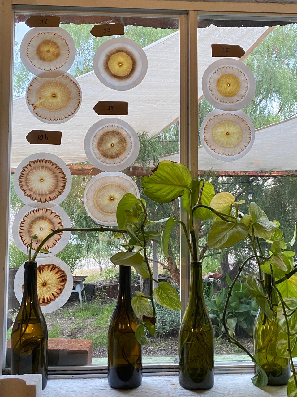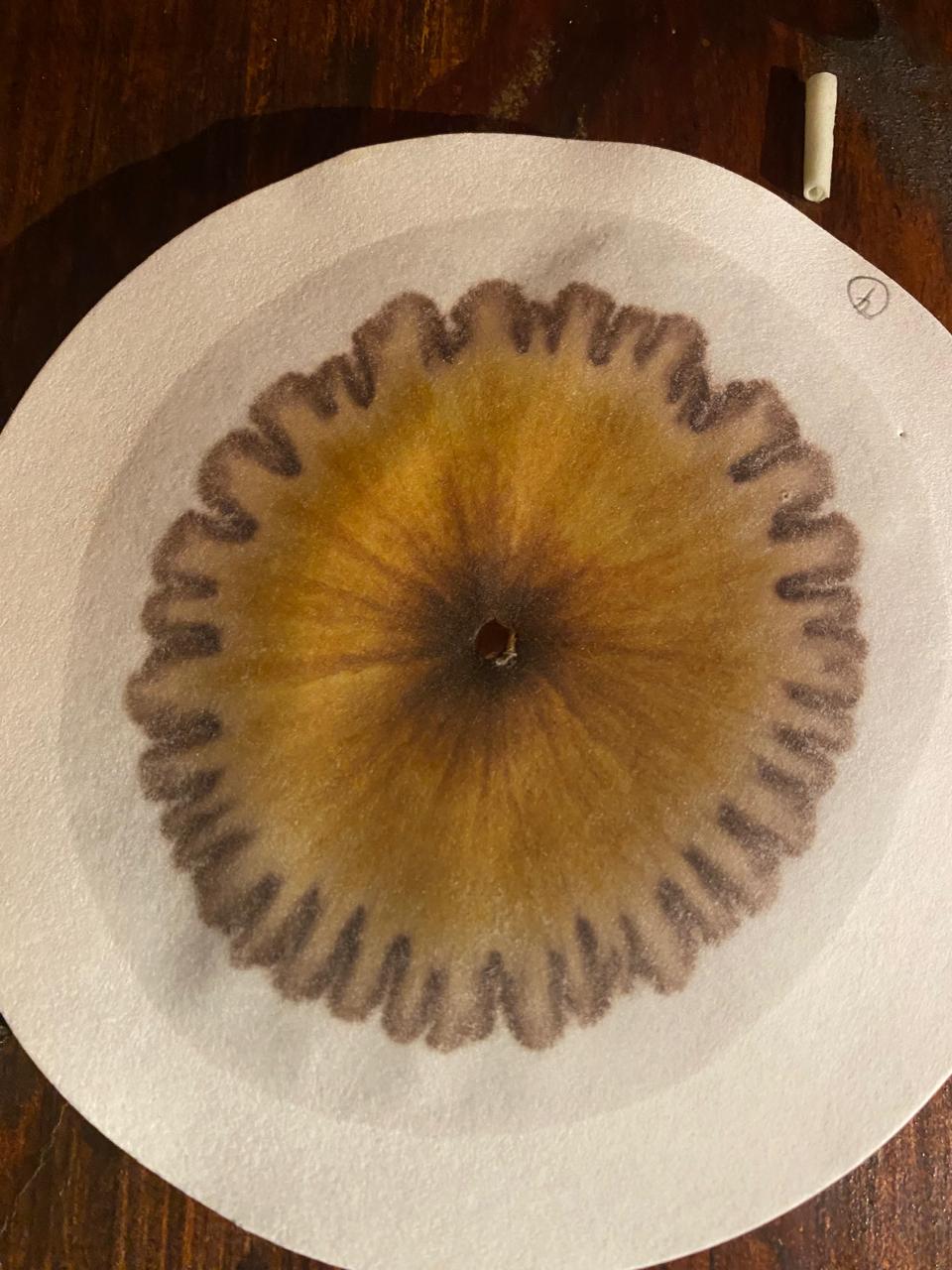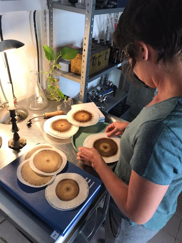 Con un poco de consciencia frente a la inmensa parte que aún desconocemos, se han logrado tantos avances científicos y metodológicos. Entre ellos, esta maravillosa técnica: La cromatografía. Dejar que una disolución de materia orgánica se expanda en un papel sensible, reaccionando con otra sustancia fotosensible, para manifestarse en gradientes de color según la densidad de sus moléculas. A través de este gesto, podemos intentar descifrar lo innombrable: las relaciones, los tejidos, el código que crea al bicho, al olor, al sabor, al mineral, a la proteína y su condición.